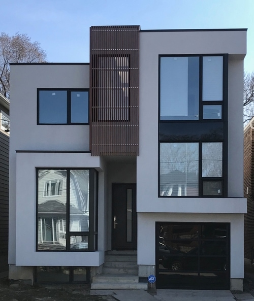 Vinyl 4-1/4” profile windows painted black interior and exterior.