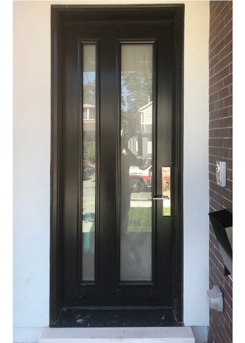 Single door system with a 36”x 95” smooth fiberglass door slab with 2 sandblasted doorlites, multi-point locking system with satin nickel handle, painted black interior and exterior, adjustable black low-profile sill.