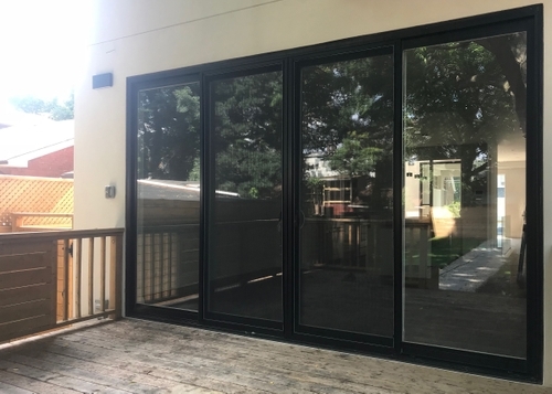 4 sectional vinyl sliding patio door painted black interior and exterior with multi-point locking system.