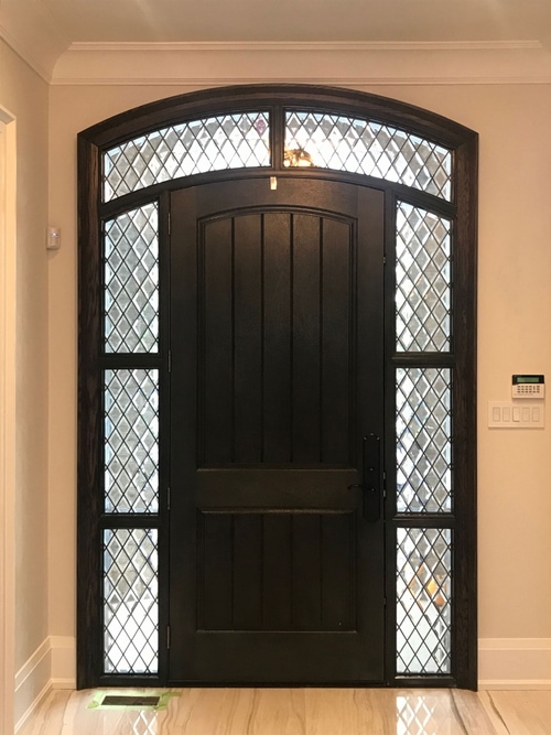 Single door system with a 42”x 95” camber top fiberglass door panel and composite door frame. Equipped with multi-point locking system and a large County black lever handle. Two sidelites and camber transom contains individual Diamond decorative pieces of glass. Exterior and interior is stained. The door threshold is an adjustable black anodized low-profile aluminum sill.